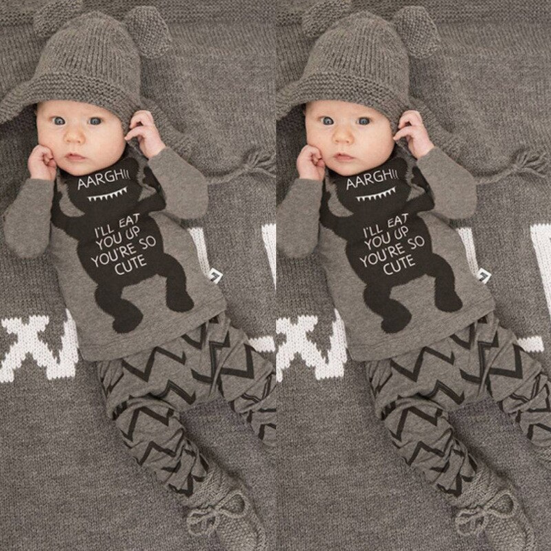 Baby Boy Clothes Set Infant Boys Gray Bear Shirt Chenvron Pants 2 Pieces Clothing Set Newborn Boy Outfit Clothes